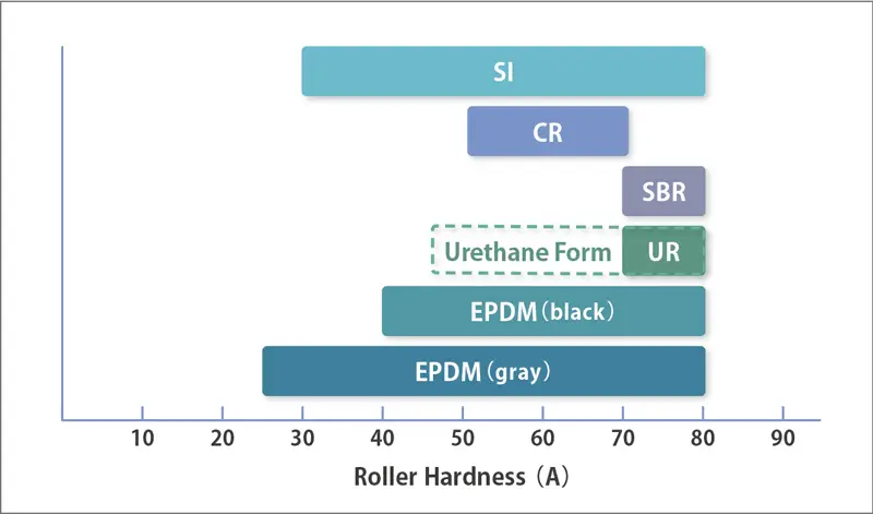 Yamauchi utilizes EPDM with hardness ranging from 20 to 45 (A) for our paper feed rollers. This material, developed using our proprietary formulation technology and extensive expertise, delivers a high friction coefficient retention and outstanding abrasion resistance. In addition to standard rolls, we also offer mass-produced belt-shaped samples to meet various customer needs. For applications requiring even greater abrasion resistance, such as high-speed machines, we can use polyurethane materials. Yamauchi provides a diverse selection of materials tailored to customer specifications, ensuring optimal performance across a range of applications.