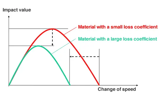 Materials with a higher loss coefficient dissipate impact energy more efficiently by converting more of it into heat. As shown, this results in: